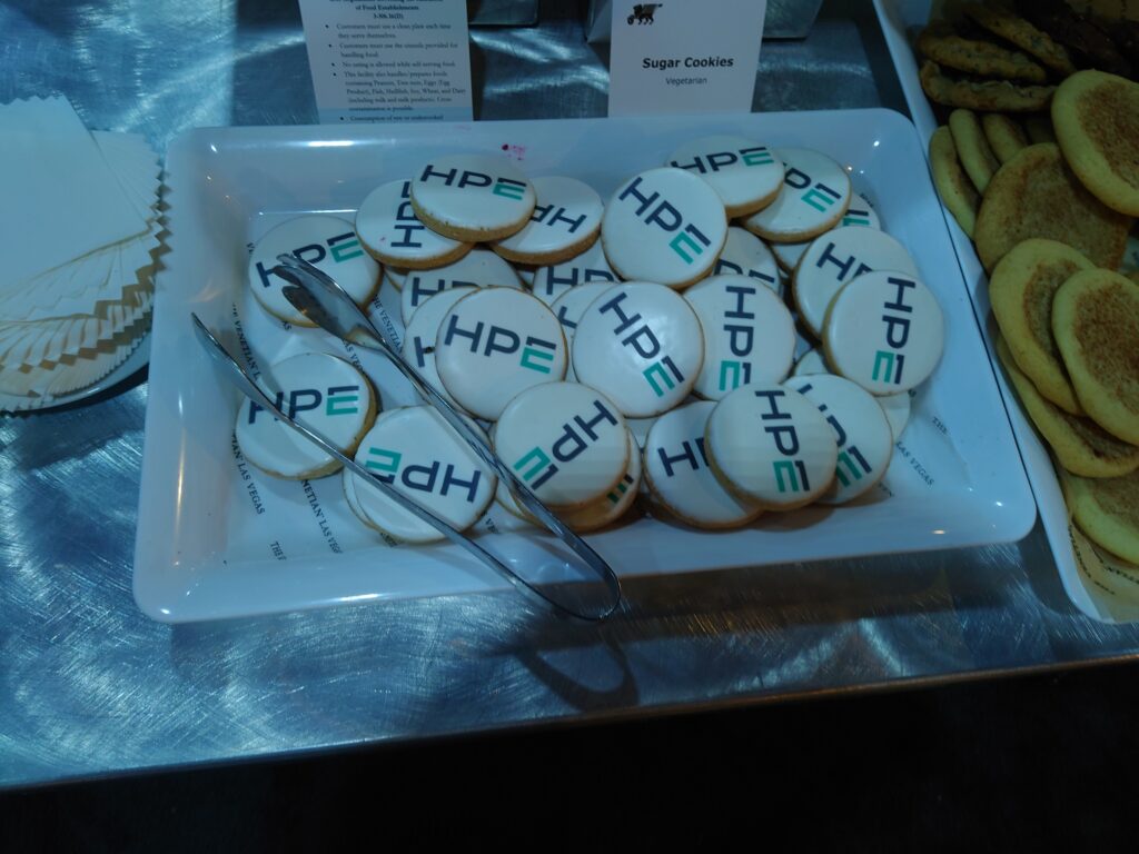 HPE社の新しいロゴの展示とそれがプリントされたクッキー。